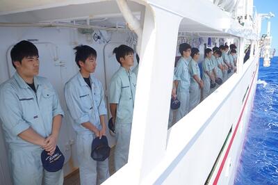 全国の水産高校では志半ばで亡くなった生徒の皆さんと乗組員のご冥福をお祈りし、その意思を引き継いでがんばるという想いからこの日を「海の安全記念日」として各水産高校で追悼しています。 写真は洋上で黙祷する様子です。
