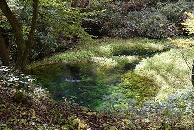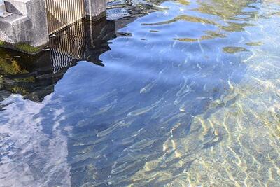 水産技術センターの水源は山を少し登ったところにある有名な「金沢清水」。長い間地下を通ってきた水には酸素があまり含まれていません。水産技術センターでは敷地にこの水を引いて噴水を作り、空気にさらして溶存酸素量を増やしてから養殖池に引き込んでいます。