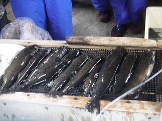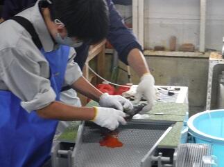 熟成した親魚。いよいよお腹を裂いて卵を取り出します。