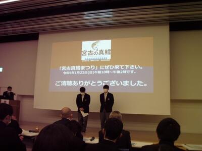 本校からは海洋生産科船舶運航コースから「宮古の海でダイビング」、食品資源コースから「宮古のマダラでにぎわい創出」の2本を発表しました。