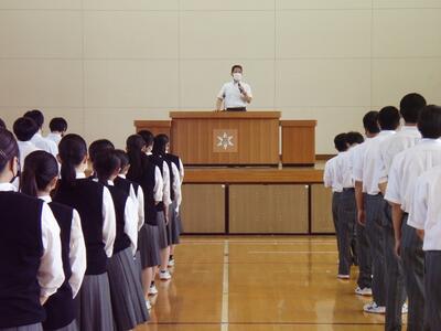 始業式「夏休み中も、中学生体験入学でのお世話、ウクライナの平和を祈るコンサート、みやこ未来議会、各部活動、社会体験アルバイト、そして進路活動、みんなよく頑張りました。今日からまた気持ちを切り替えて頑張りましょう!」